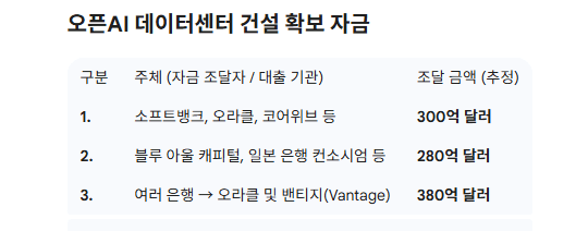 또, 지난 11일에는 월가의 자산 운용사인 블루 아울 캐피털이 오픈AI의 뉴멕시코 대형 데이터센터에 30억달러를 투자할 것으로 알려졌다. 여기에 스미토모 미쓰이, BNP 파리바, 골드만삭스, 미쓰비시 UFJ 금융그룹 등 일본 은행 컨소시엄은 180억달러 규모의 대출을 주선했다고 전해졌다.